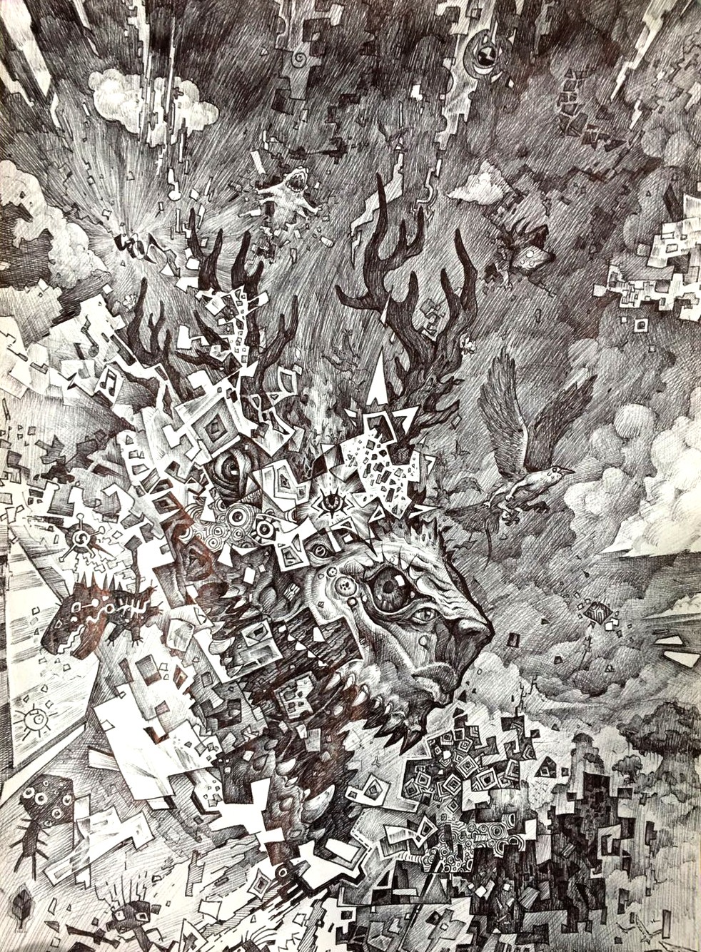 在圆珠笔绘制的纸笔空间中寻求无法改变一次成型的过程中,寻找空间与想法上的多层次多次元空间共存与展示,在二维与三维之间寻找平衡点,在线条的空间描写中寻找卡通与写实的共存,建立光影与平面的层次融合。