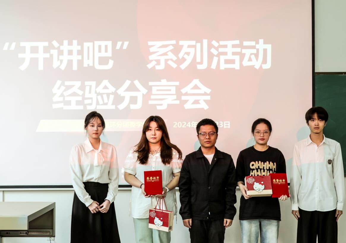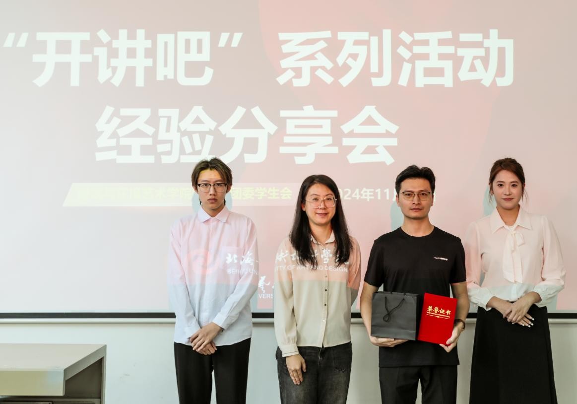 活动的最后,由建筑与环境艺术学院教务办田鹏老师为两位学姐颁发证书和奖品,以及建筑与环境艺术学院分团委陈宣辰副书记为张老师颁发证书和礼品。最后,所有的领导、老师和主讲人及现场的工作人员一同合照,为本次活动留下美好的回忆。本次“开讲吧”系列活动圆满结束!(王荣禄、战思伊/摄)