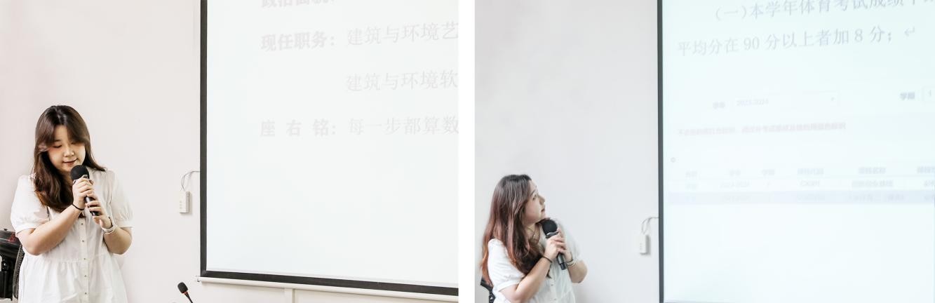 本场活动邀请的第一位学姐是来自建环学院环境设计专业的王晨燕学姐,学姐以自己丰富的阅历、优异的成绩,告诉我们“德育、智育、综合”共同发展的重要性,她经验介绍非常鼓舞人心,她的勇气和决心令在场的观众们感到钦佩。