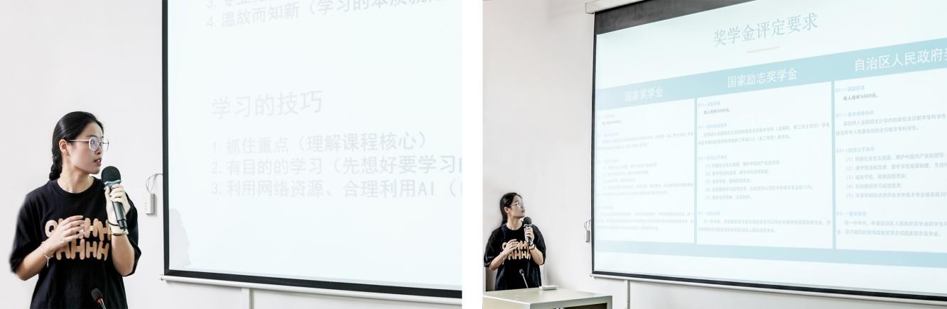 邀请的第二位学姐是来自建环学院环境设计专业的李未学姐,学姐给大家分享了学习专业知识的网站,传授自己的学习经验,以及提高学习成绩方法。以亲身经历激励同学们积极的参与校内外各项竞赛与实践活动,她激情的演讲激励了新生们。
