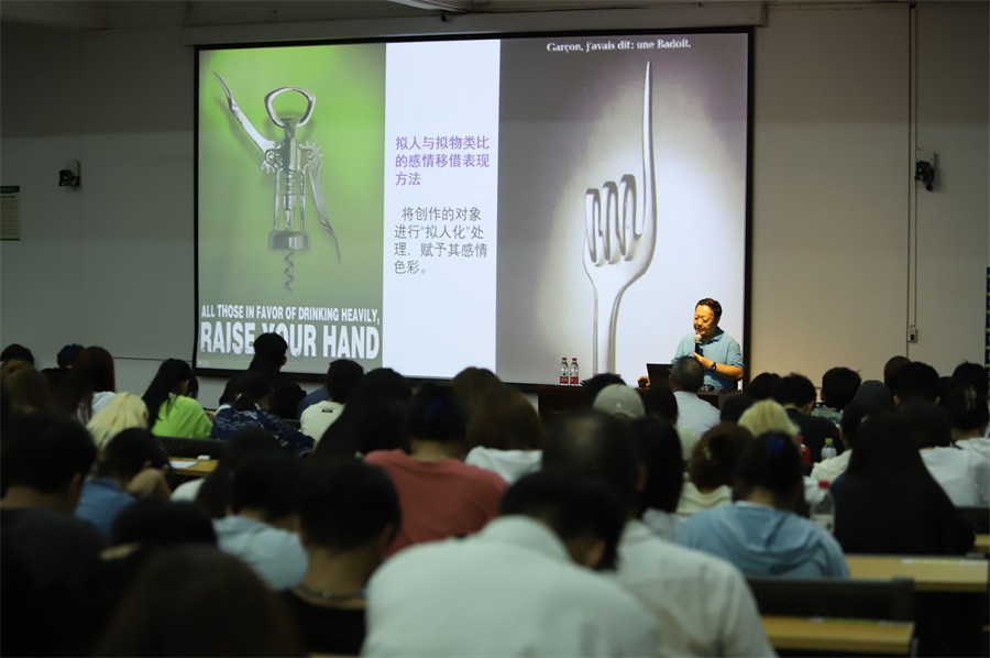 讲座开始,张夫也教授简单概述了艺术与设计的形象思维,强调了形象思维在设计中的重要地位,他通过评析油画《大家族》中的内容,向在场师生介绍作品里体现的形象思维,展示了一种强烈、另类的想象空间。张教授详细阐述了人类头脑对自然界的事物的高级反应和高级认知,讲解了智力与智慧的内在联系,进一步引出“智力是一种有结构的能力系统,想象是一种特殊形式的思维”的观点,向在场师生介绍思维的特点和分类:形象思维、抽象思维、灵感思维和创造性思维,并进一步解析其中的内在含义,张教授又通过一系列的国内外知名的设计作品与案例,生动形象地展示了每一个作品所体现的思维特点,令广大师生对思维有了更深刻的认识。