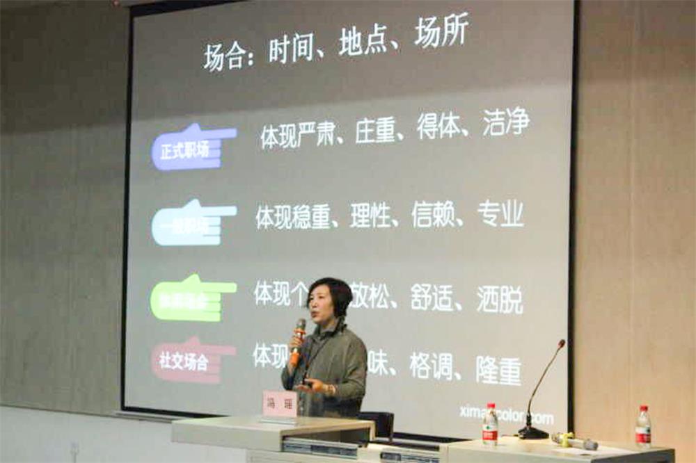 冯瑶讲师通过讲述色彩是一种表达方式,希望同学们寻找属于我们自己的色彩,恰当和谐的选择适合自己的风格,让形象更加立体,张显个性。并且在不同的场合着装各有不同,要表达准确有序的形象,理解美背后的理性秩序。
