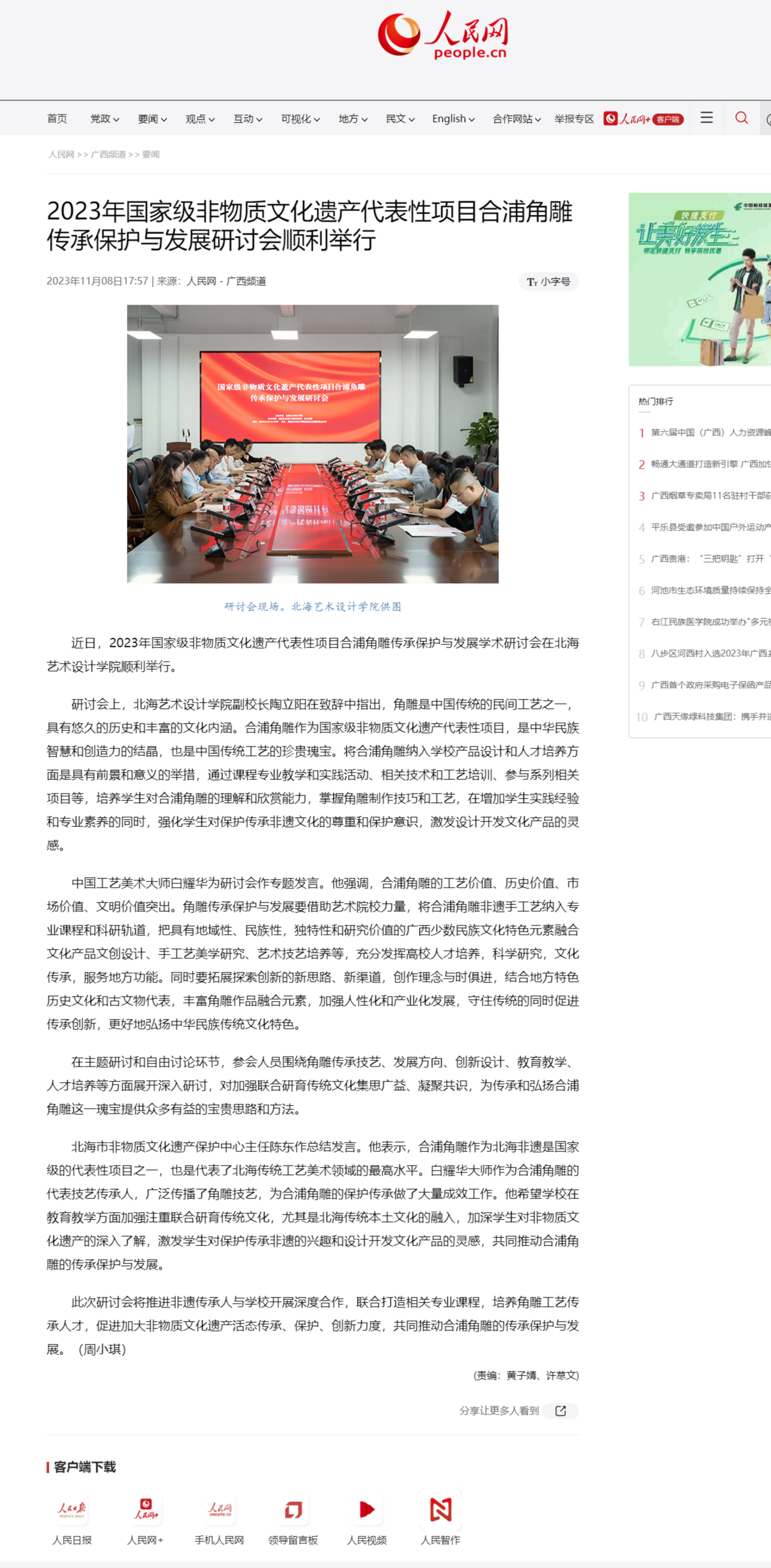 人民网:2023年国家级非物质文化遗产代表性项目合浦角雕传承保护与发展研讨会顺利举行