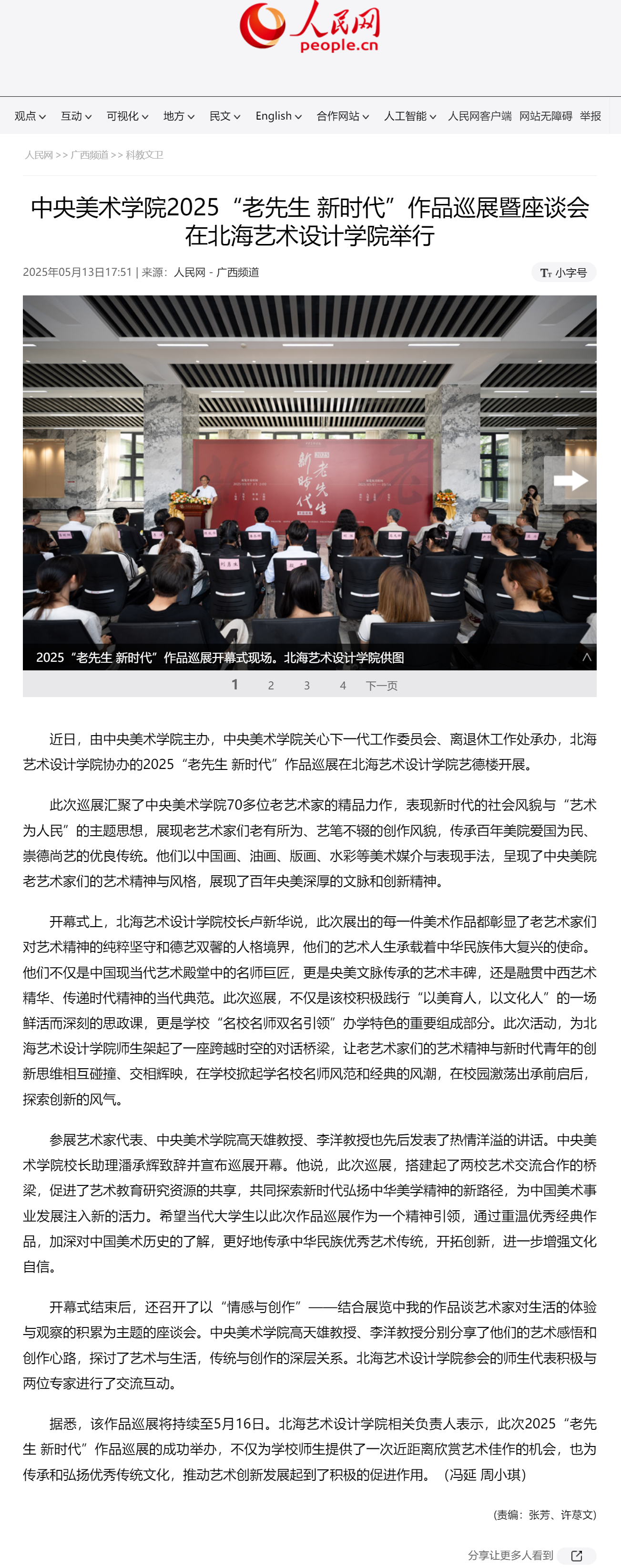 人民网:中央美术学院2025“老先生 新时代”作品巡展暨座谈会在北海艺术设计学院举行