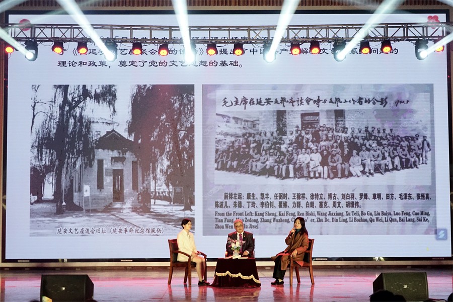 舞毕灯灭,时间线又拉回到晚会现场,聚光灯下,我校马克思主义学院院长姜献生、副院长罗秋梅、教师苏李荧紧扣我校艺术设计类本科高校特色,现场分享了党的文艺思想的发展历程。一是1942年5月,中共中央宣传部在延安杨家岭召开的文艺座谈会,毛泽东发表了《在延安文艺座谈会上的讲话》,提出了中国共产党解决文艺一系列问题的理论和政策,奠定了党的文艺思想的基础。二是在1956年9月党的八大确认了“百花齐放 百家争鸣”的“双百方针”,将其写进了政治报告和关于政治报告的决议。三是1964 年9月,毛泽东提出了“古为今用,洋为中用”的文艺方针。四是随着改革开放,文化思想不断繁荣。1980年7月,《人民日报》发表了题为《文艺为人民服务,为社会主义服务》的社论,明确以“文艺为人民服务、为社会主义服务”取代“文艺为工农兵服务、为无产阶级政治服务”。从此,“二为”成为文艺界指导性的口号。五是2014年10月,习近平总书记主持召开文艺工作座谈会并作重要讲话,他指出:实现中华民族伟大复兴需要中华文化繁荣兴盛,中国精神是社会主义文艺的灵魂,要创作无愧于时代的优秀作品,坚持以人民为中心的创作导向,加强和改进党对文艺工作的领导。六是2023年10月,全国宣传思想文化工作会议正式提出习近平文化思想,这是新时代党领导文化建设的理论创新和实践总结,标志着我们党对中国特色社会主义文化建设规律的认识达到新高度。马克思主义学院院长姜献生在分享中强调,我校作为艺术设计类本科高校要坚持贯彻落实党和国家文艺思想的核心内涵,以实际行动切实担负起新时代新的文化使命。