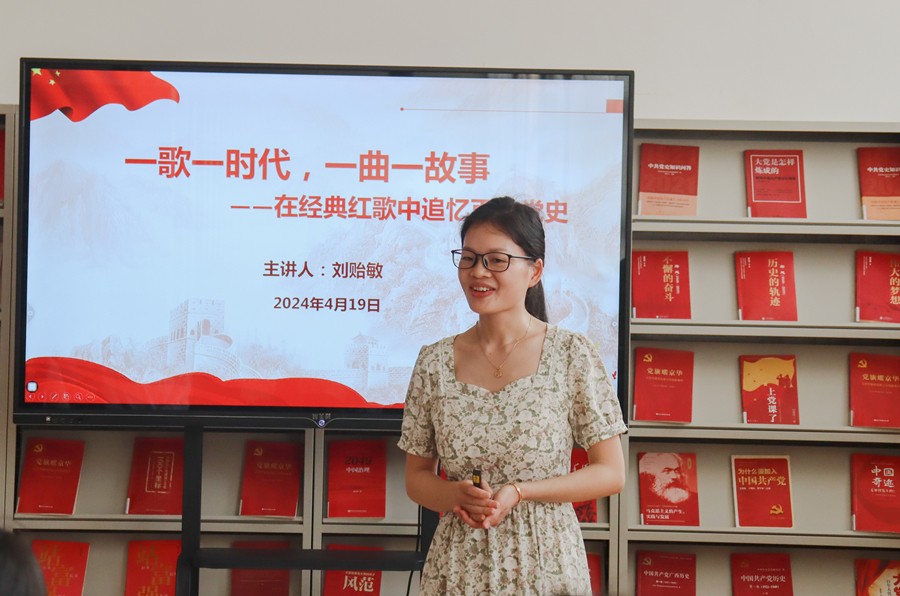 4月19日下午,马克思主义学院刘贻敏老师在图书馆三楼“红色阅读角”带来了一场题为“一歌一时代 一曲一故事——在经典红歌中追忆百年党史”的红色专题知识精彩讲座。