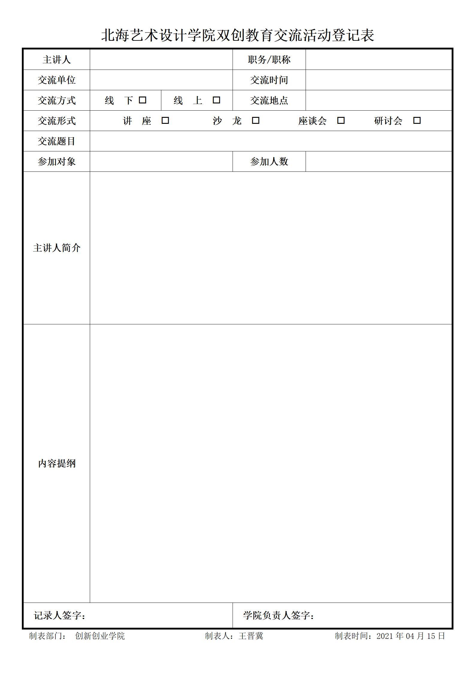 北海艺术设计学院双创交流活动登记表