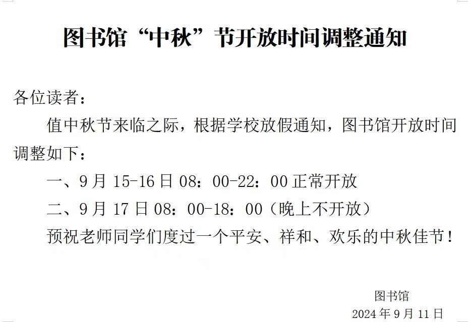 图书馆“中秋”节开放时间调整通知
