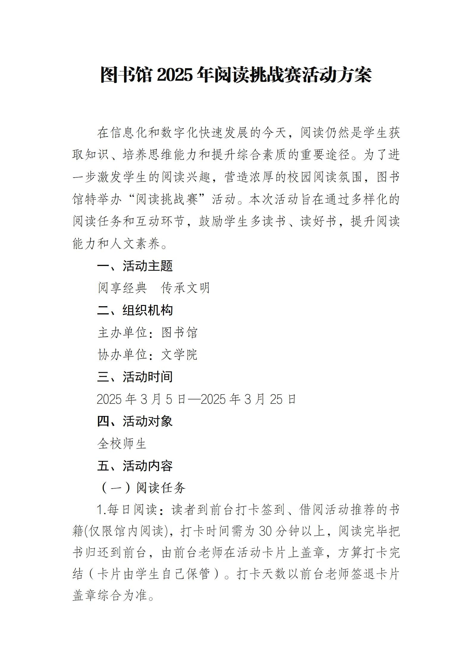 图书馆2025年阅读挑战赛活动方案