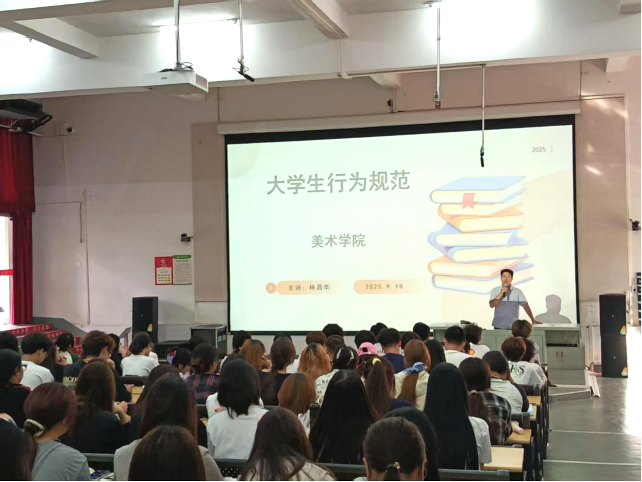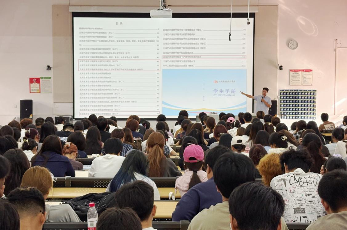 9月10日上午,美术学院在公德楼107开展大学生行为规范教育,由美术学院学工办主任林昌华主持,全体美术学院2025级新生参加。