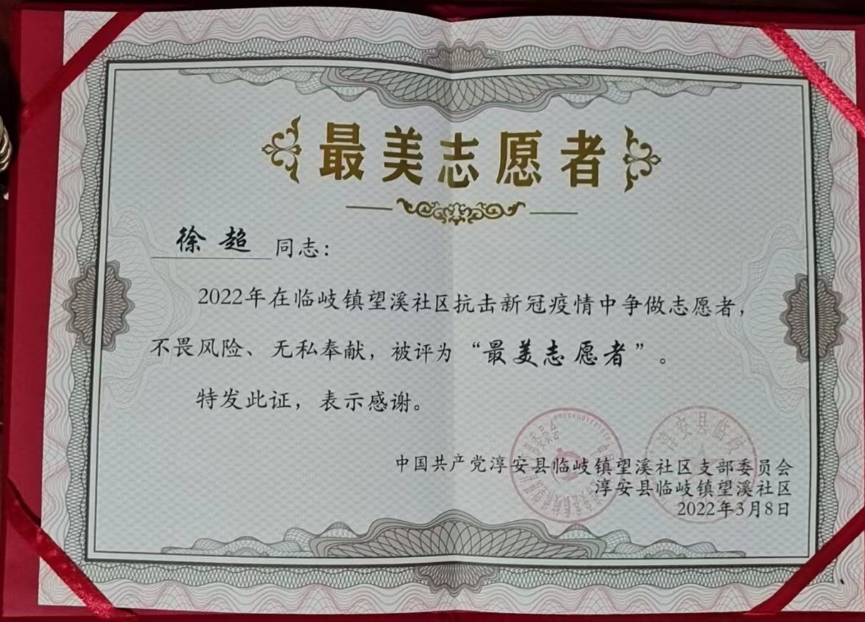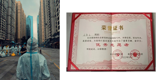 2022年2月,疫情形势变得严峻起来,而这个时候正值春运,疫情防控面临的任务更加繁重艰巨。杨子贤同学响应当地政府号召,主动加入志愿者队伍,积极参与当地疫情防控工作。在工作期间,认真负责,能力突出,协助有关部门完成各项任务,被当地政府评为“十佳志愿者”荣誉称号。