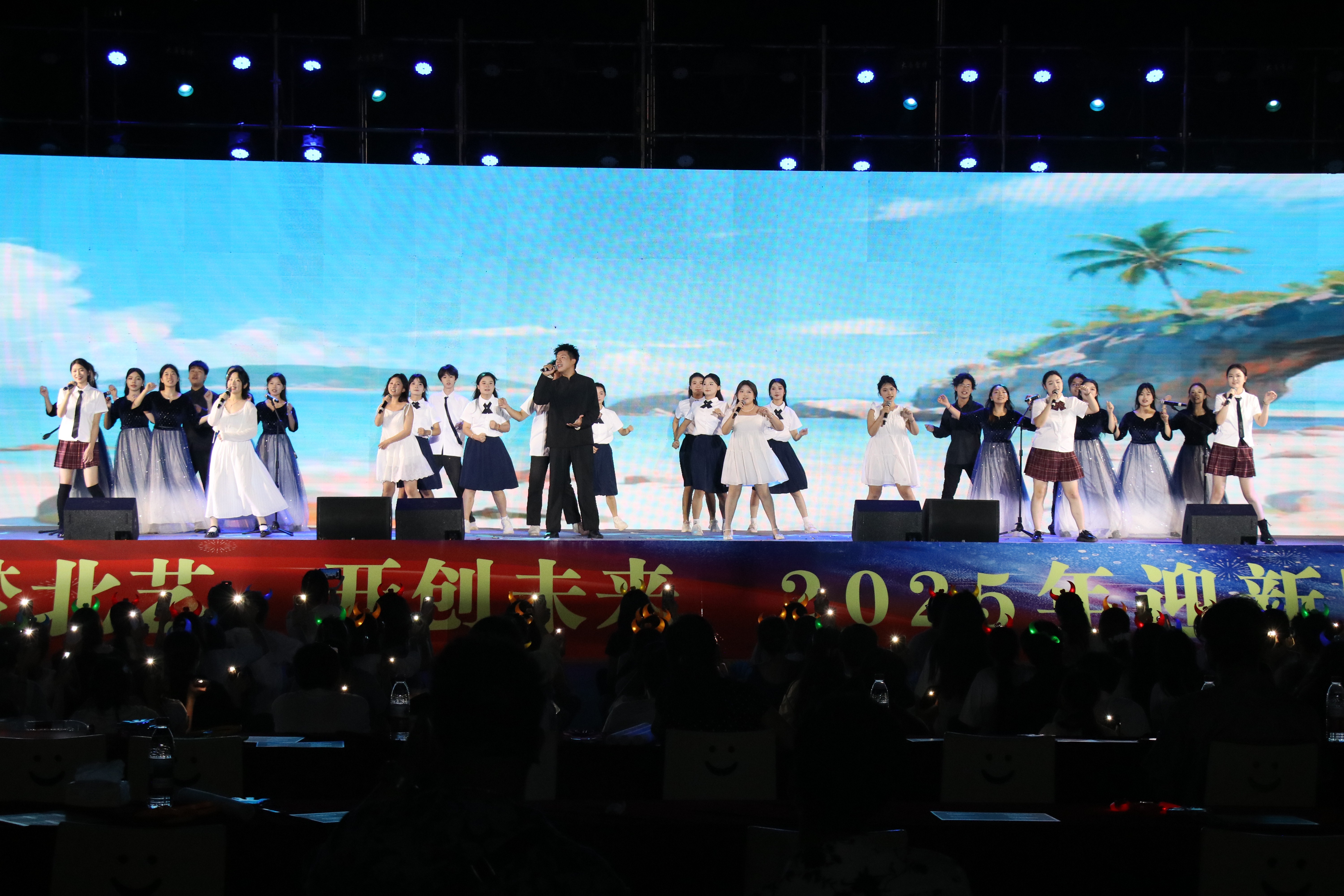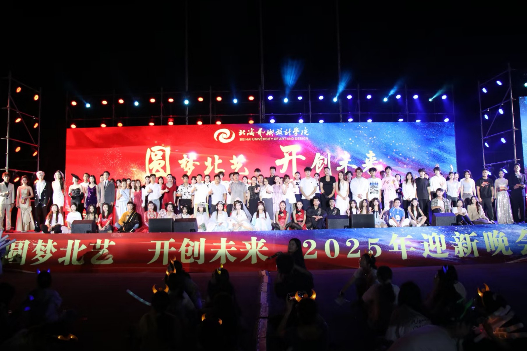 10 月 11 日,北海艺术设计学院 “圆梦北艺,开创未来”2025 年迎新晚会在西区操场举行。党委书记覃宪儒,党委副书记陈毅华、彭仁、刘承初,副校长何煜及各处室、二级学院负责人与师生共同观看演出。