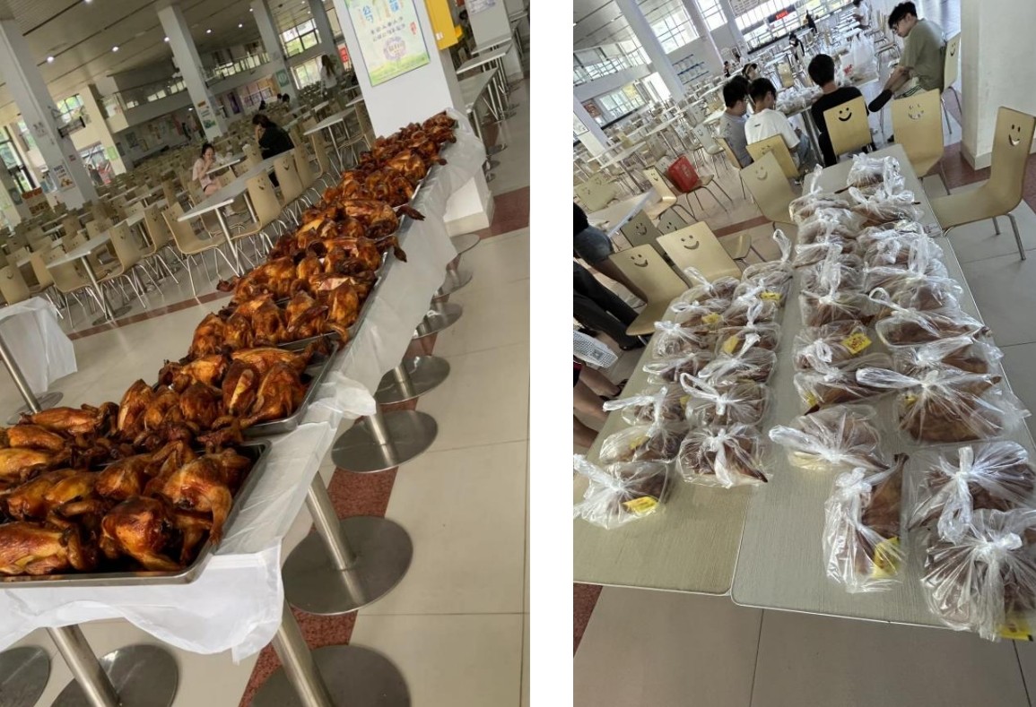 书法学院学工办教师全程组织本次活动,一只只新鲜出炉的烧鸡干净整齐地摆放在学校食堂发放台,散发着无比诱人的香气,每位学生在领取队伍中都绽放出开心的笑容。我校以实际行动传递了对每一位学子的关爱,让每一位离家甚远的学生都能感受到家的温暖。