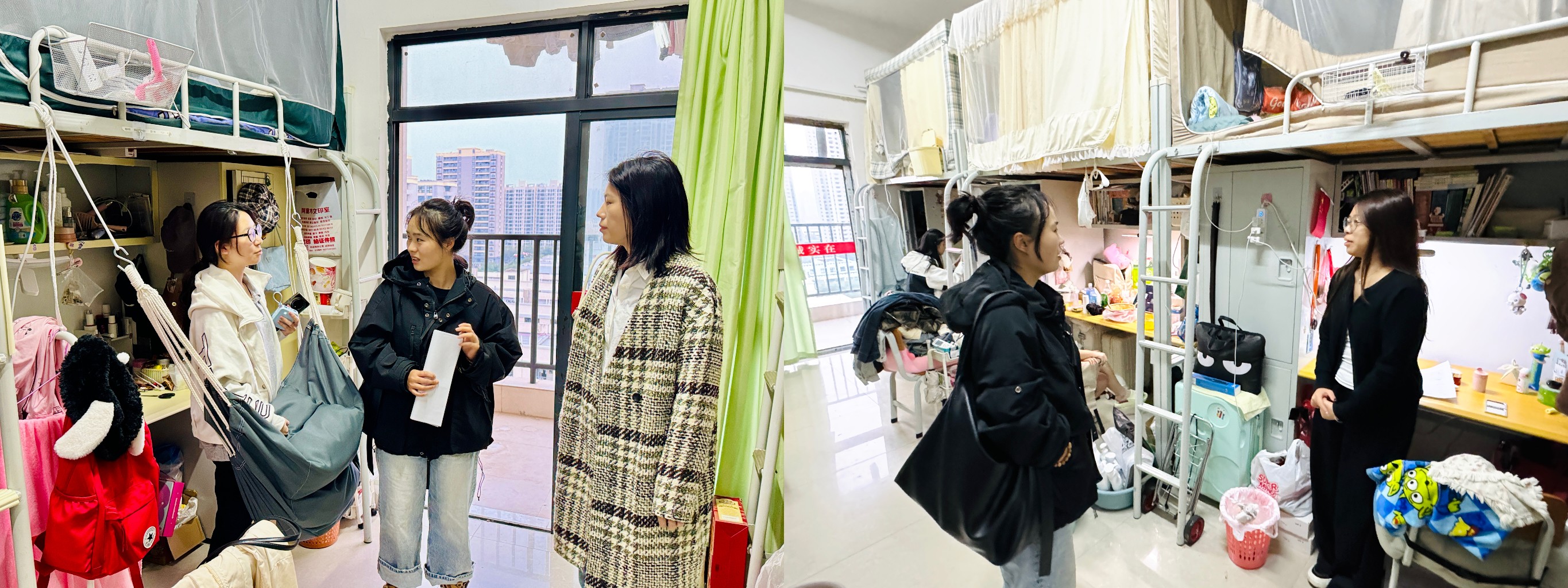 走访过程中,曹永攀书记与学工教师们轻叩宿舍门扉,走进学生生活空间,与同学们面对面亲切交流。教师团队细致查看宿舍卫生环境与安全设施,叮嘱学生注意用电安全、保持宿舍整洁,同时重点关注大二、大三学生的学业进展与专业规划,针对服装专业课程学习难点、实践项目参与等问题,结合学院资源给出具体建议。