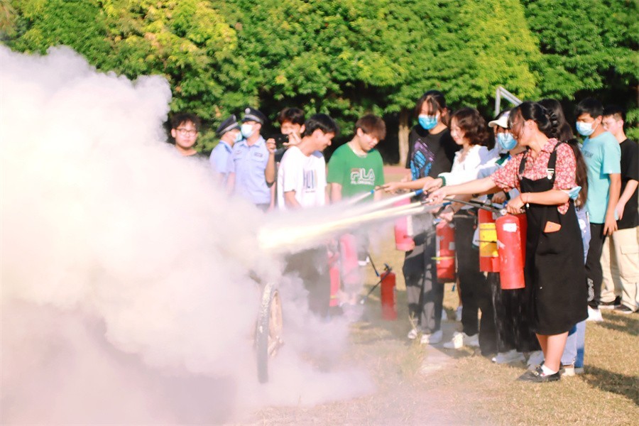 现场师生在了解了灭火器的摆放位置、干粉灭火器的正确使用方法和技巧之后,在工作人员的指导下,在场师生纷纷参与学习灭火器的科学、规范实操,提高了师生的防火灭火能力。