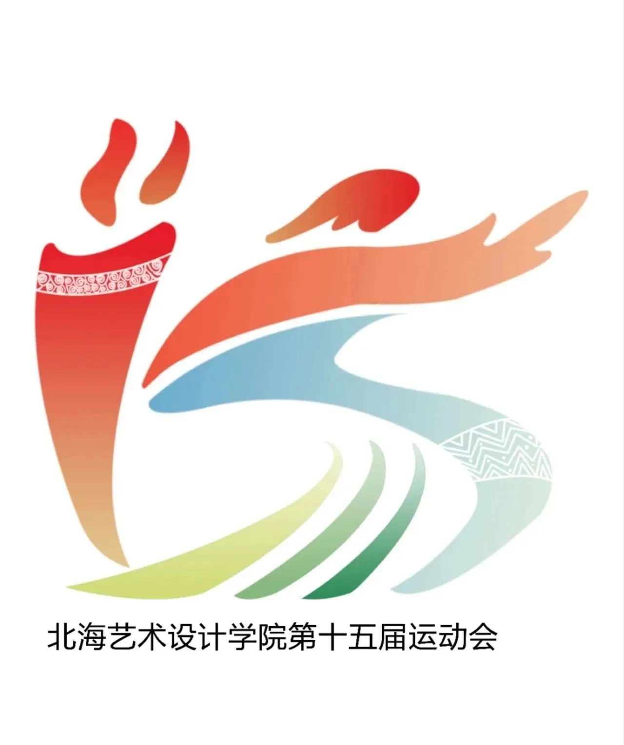 学前2102符才丽:会徽图案以飞奔的运动健儿为主元素,意指运动健儿在赛场上驰骋,运动健儿以文字“北”为造型,与北海艺术设计学院的“北”字有机结合。其中,“北”字里面包含了数字“15”,代表着第十五届运动会,强调了运动会的历史延续和传承。在色彩上,以蓝色、红色为主色调,再辅之以黄、绿、浅蓝进行渐变点缀。整个会徽的设计简洁大方,色彩鲜明,形象生动。传递出第十五届运动会的精神内涵和文化价值,彰显出北海艺术设计学院的体育精神。