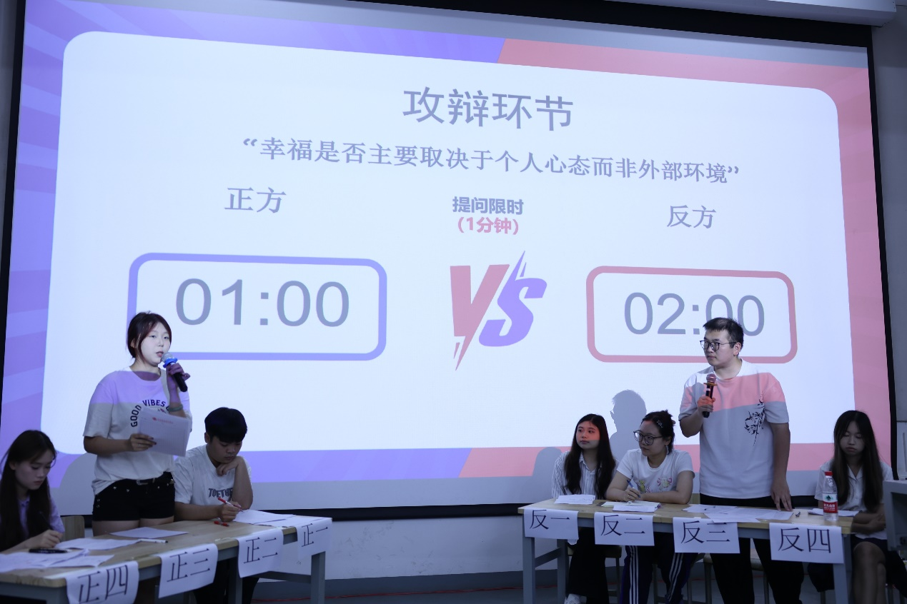 首场辩论围绕“幸福是否取决于个人心态而非外部环境”展开交锋。正方选手通过事例论证心态对幸福的决定性作用;反方立足现实强调外部环境的关键影响。双方辩手思维敏捷、妙语连珠,在自由辩论环节更是金句频出,激起了现场活跃的气氛