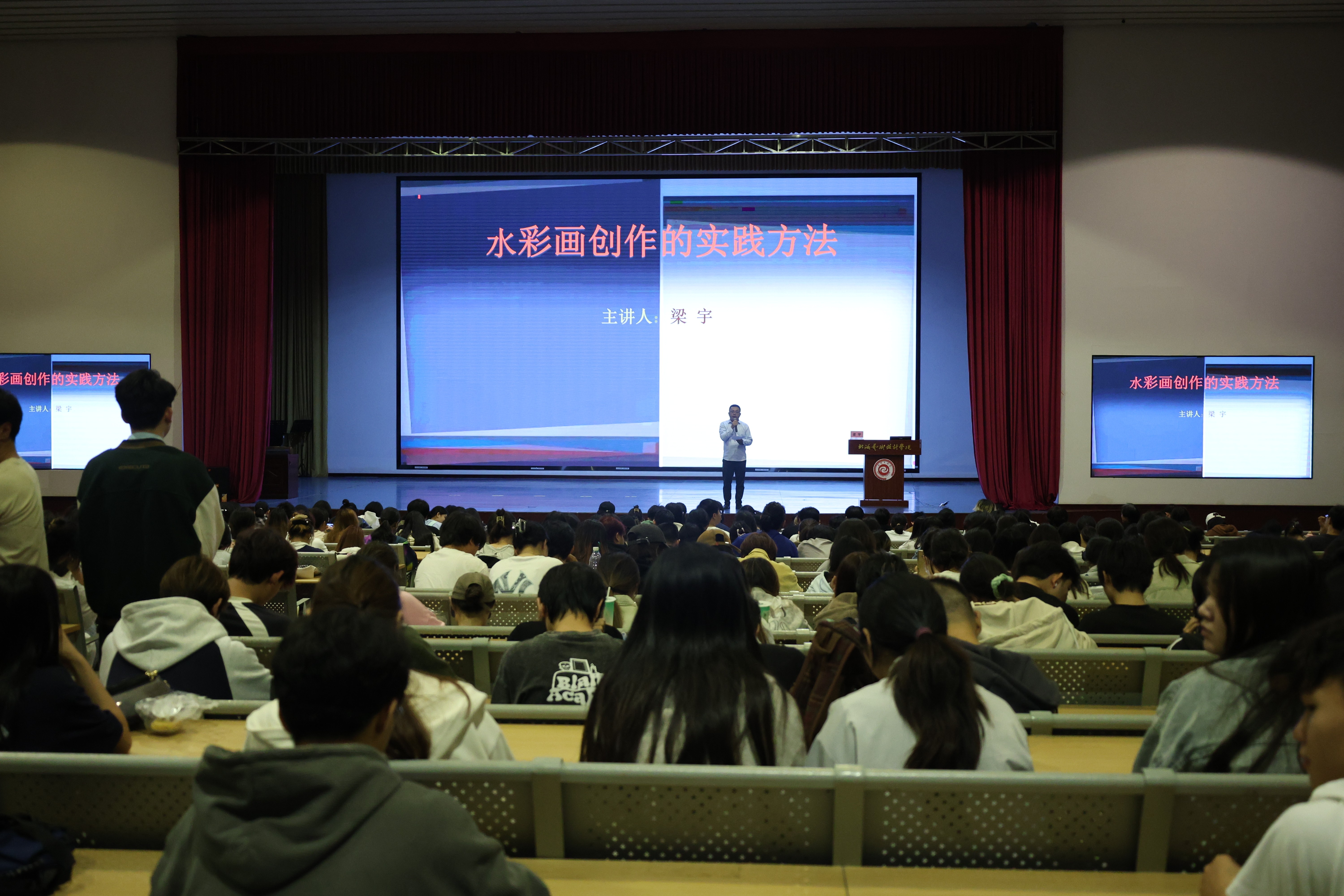 125日晚,一级美术师,著名水彩画家梁宇教授莅临我校,在西校区大礼堂为学校师生带来一场题为《水彩画创作的实践方法》的精彩讲座。美术学院20222023级绘画和美术学专业师生热情参加,讲座由美术学院执行院长龚为主持。