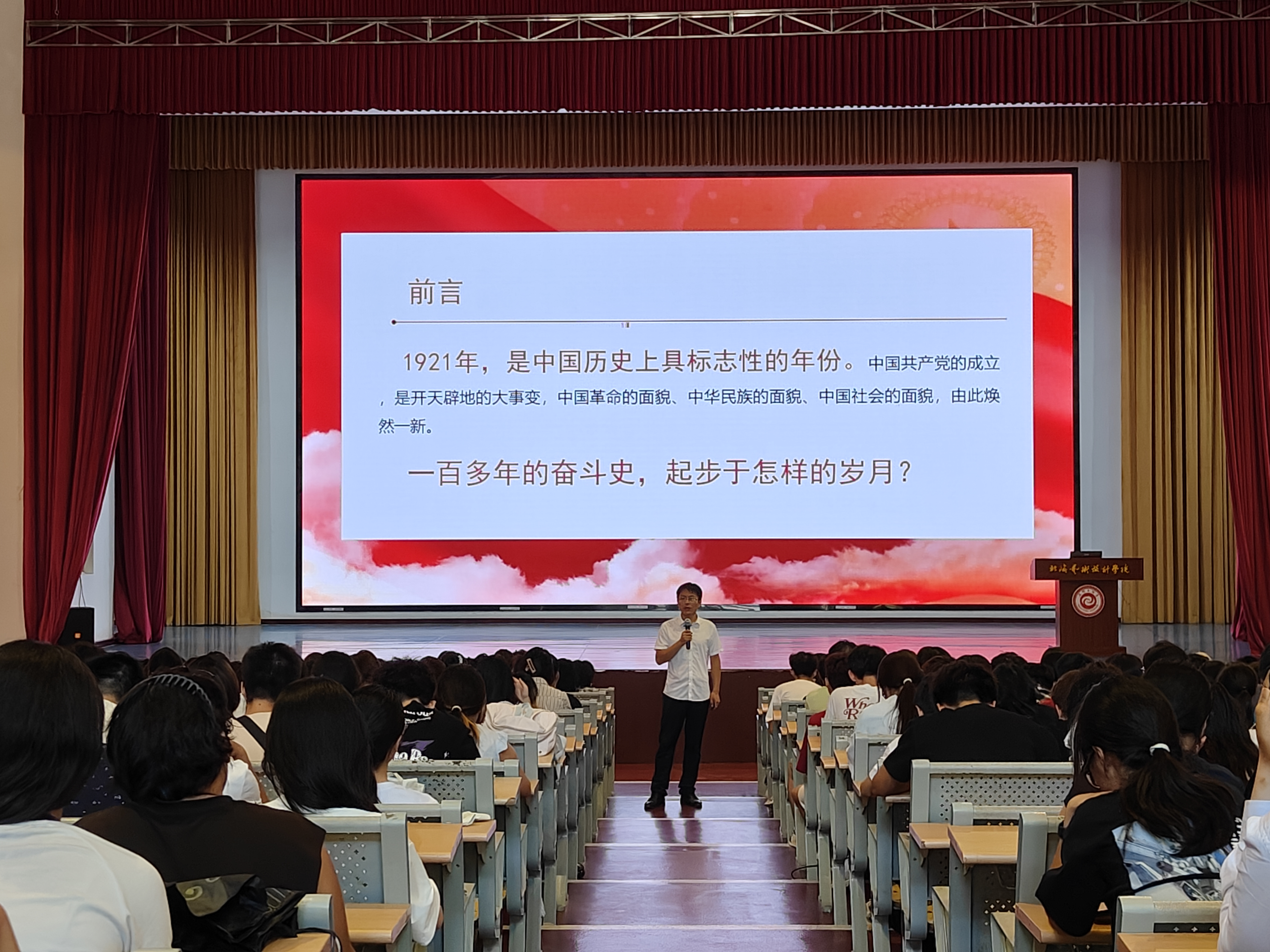 9月12日,在传媒艺术学院在西校区大礼堂举行2025级新生开展入党启发教育专题讲座,传媒艺术学院党总支副书记杨若飞、副院长张海峰、学工办主任田多元、2025级辅导员及全体新生共同参加。