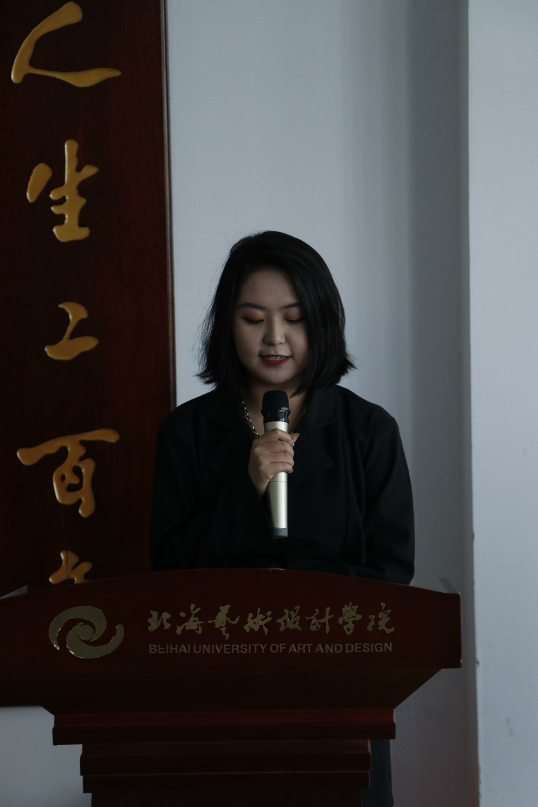 北海市美术家协会主席肖畅恒讲话,他表示很高兴能与北海的高校进行互动,并预祝本次展览成功。
