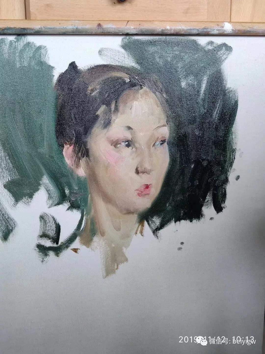 范画过程中,米·顾依达院士讲解了写生与创作的区别,强调了绘画中运用色彩冷暖关系的重要性,从而更好地塑造模特形象。而作画时用笔的轻重、虚实对比、光线变化等方面对于把握好整幅画至关重要。在此基础上,逐渐着色自然过渡。米·顾依达院士一边范画一边认真讲解,让我们明白了空间关系的细腻表达更容易凸显人物形象,以及背景的重要衬托作用。