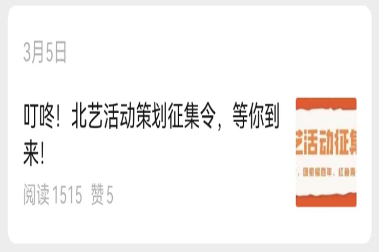 2022年3月5日至4月2日为庆祝中国共产主义青年团建团百年、喜迎党的二十大召开,校举办以“团徽耀百年,青春需出彩,喜迎二十大”为主题的“北艺活动策划征集令”。此次活动旨在全体北艺学子以青春之名,献礼建团百年,喜迎党的二十大。