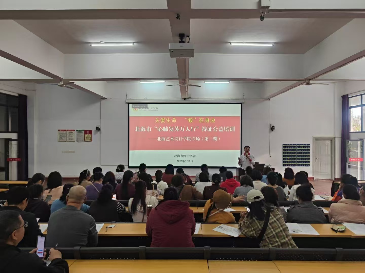 为提升学校师生应急处置能力,普及应急救护知识,增强安全防范意识,2025年2月28日-3月7日期间,校医务室联合北海市红十字会在校内举办了三期“心肺复苏万人行”公益培训活动。