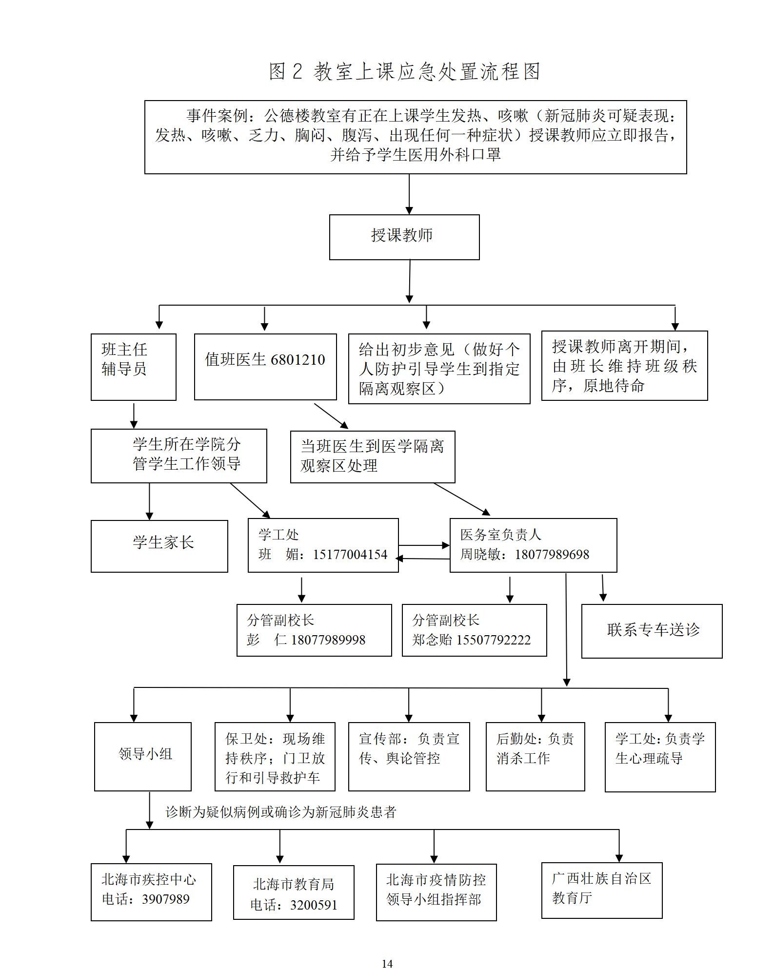 (四)扎实做好疫情应对准备。加强与自治区教育厅、北海市教育局、北海市卫生健康部门、辖区医院的沟通与协作,获取专业指导,加强联防联控;按照属地管理原则,加强与北海市卫生健康委、北海市疾病预防控制中心、北海市银海区新冠疫情防控指挥部、辖区医院的联系,建立协调联络机制。一旦发生疫情,须严格依法依规报告,及时启动应急处置预案,落实相关处置措施。
