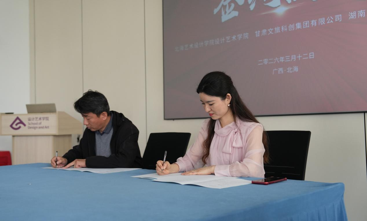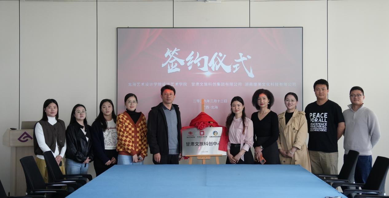 2026年3月12日,北海艺术设计学院西校区伦理楼408会议室迎来了甘肃文旅科创集团代表、湖南煌果文化科技有限公司负责人王平一行企业代表与设计艺术学院白建强副院长、杨林副院长等领导及多位专业骨干教师就甘肃文旅设计项目合作事宜展开深入交流,并签署了三方合作框架协议。此外,还举行了“甘肃文旅科创中心”揭牌仪式。