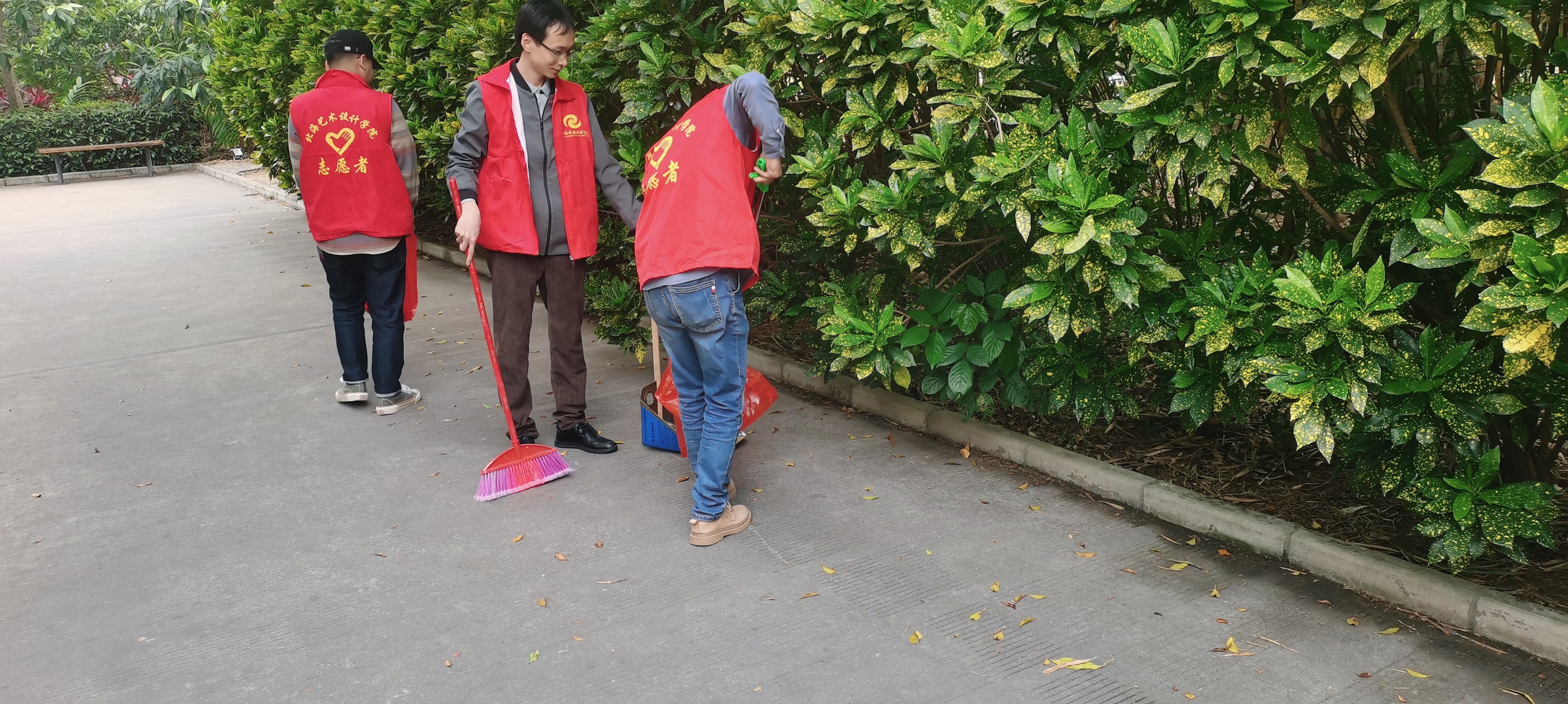活动中,志愿者们身穿红马甲,拿着铲子、扫把等各类清洁工具,围绕西校区文化石碑长廊及周边绿化带开展了卫生清洁,集中清理了片区的烟头、纸屑、果皮、塑料等垃圾,做到全覆盖、无遗漏、无死角。