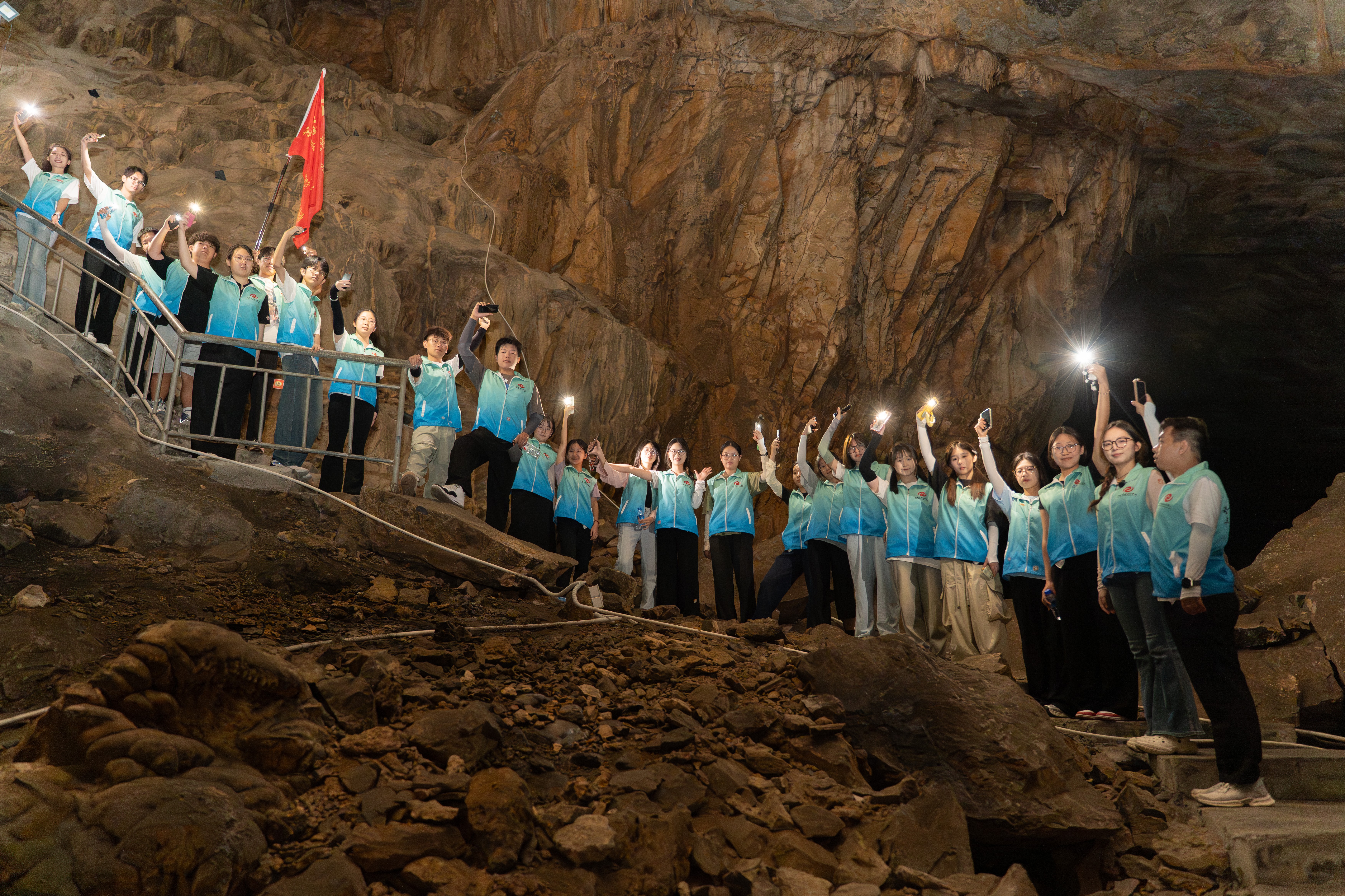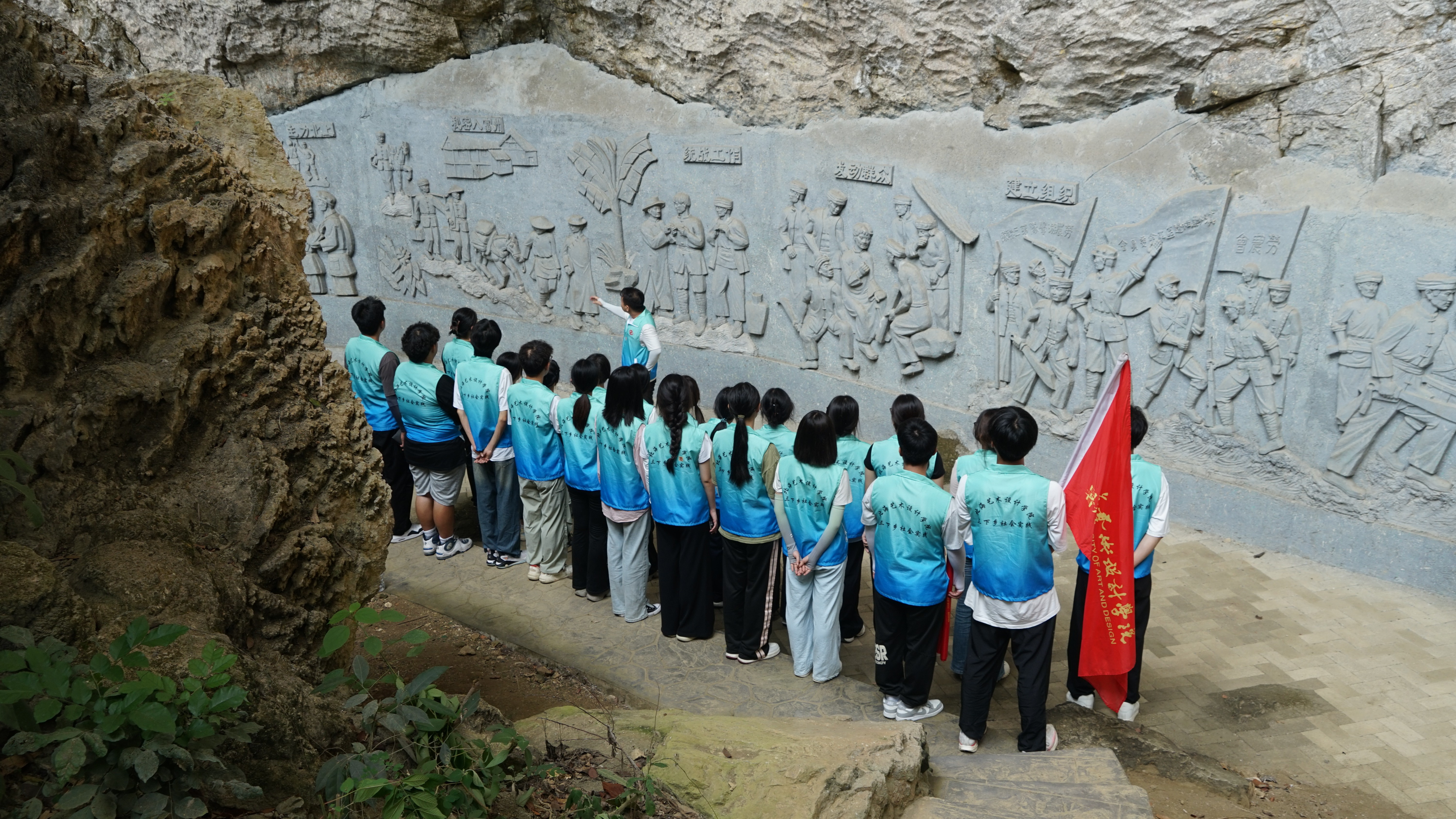 讲解结束后,宣讲团成员怀着崇敬的心情,沿着崎岖的山路,走进红军洞内部。洞内环境幽暗潮湿,道路蜿蜒曲折,宣讲团成员们相互搀扶,小心翼翼地前行。墙壁上的痕迹、狭窄的通道,无一不在诉说着当年的艰辛与不易,也让大家更加深刻地体会到革命胜利的来之不易。